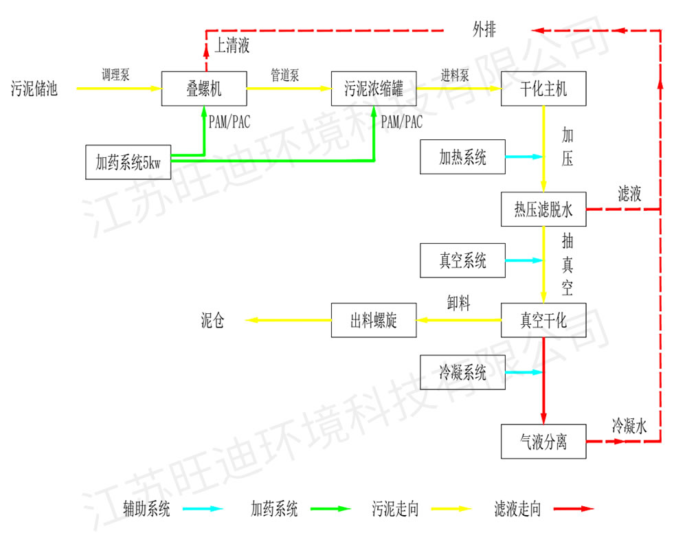污水处理厂浓缩池中的含水率96~98%的浓缩污泥,通过污泥泵输送至污泥调质池内。在污泥调质池内对污泥进行调质、调理,满足进料要求后,通过进料系统进入主体设备。(含水率98%,直接处理到含水率40%以下)